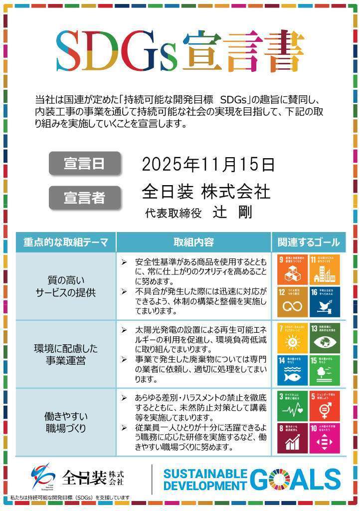 この度、私たち全日装 株式会社は、持続可能な開発目標(SDGs)の達成に貢献することを目指し、自社の「SDGs宣言」を策定いたしましたことをご報告いたします。
